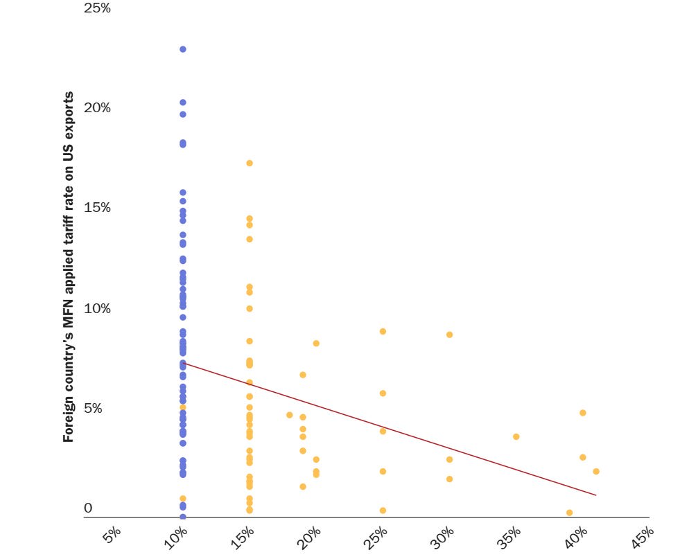 So the first big problem with the argument that reciprocal tariffs work to get other countries to drop tariffs is that the tariffs imposed aren’t reciprocal. Instead they inversely correlate with tariffs, which is a bit like getting someone to stop slapping you by paying him money when he slaps you.