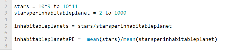 Now let’s turn to the inhabitable planets example. I use interval estimates for the number of stars in the galaxy and the number of stars per inhabitable planet. Because of the uncertainty the bounds of my intervals differ by 2-3 orders of magnitude.