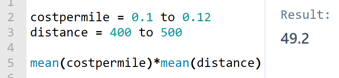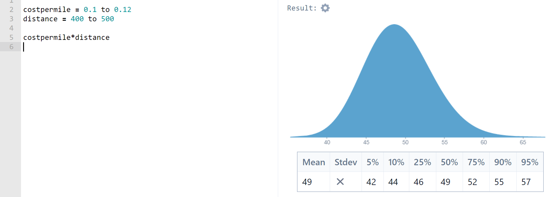Let’s start with Fuel Cost. Using Squiggle (which uses lognormal distributions by default; see the next section for more on why), I enter 90% confidence intervals to build distributions for fuel cost per mile (USD per mile) and distance of my trip (miles). This gives me an expected fuel cost of 49.18USD