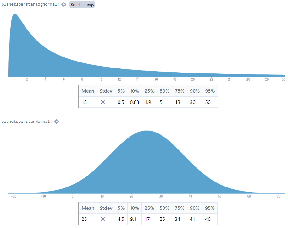 With the Inhabited Planets example, however, there is a different story. Using 0.5 and 50 as the 5th and 95th percentiles, I get very different-looking distributions: