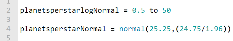 Which is a better match for our understanding of the situation? In my opinion, the lognormal distribution is better. if we expect the number of planets per star to be between 0.5 and 50, the “expected” number of planets should be closer to 13 than to 25. Furthermore, the normal distribution assigns a nontrivial probability to (impossible) negative outcomes.