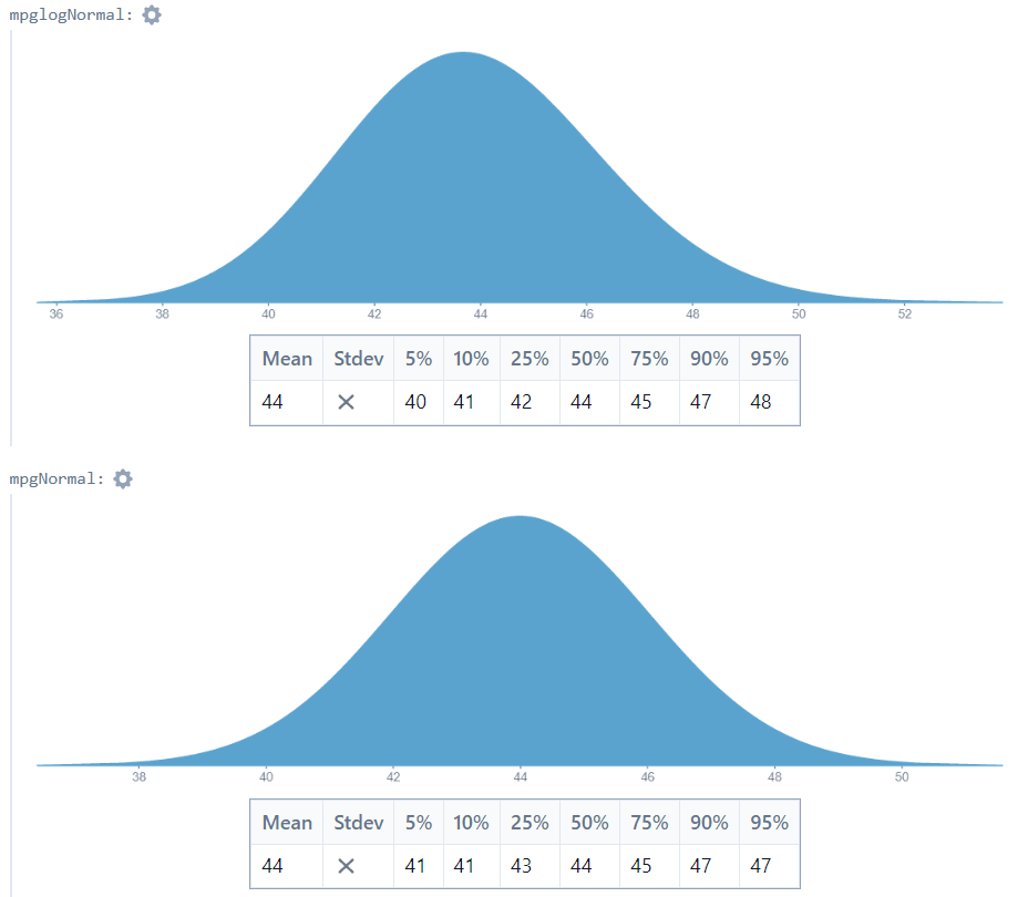 In this case lognormal and normal look very similar, and the distributions give means of 39.885 and 40 respectively.