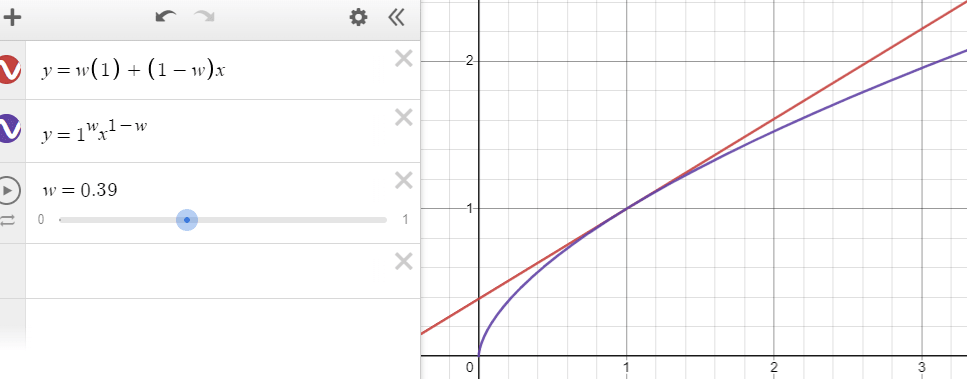Interestingly, it hardly matters which mean we use when the ratio between inputs is low.
