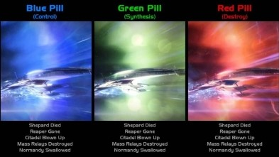 Mass Effect is a series of video game RPGs which involved significant impacts downstream of the player's choices. In 2012, the trilogy conclusion was released and widely disliked because the player's final choice led to endings were too similar and mostly paved over the impact of all of the player's other choices. As mocked in this image, the background lighting color was different, and not much else.