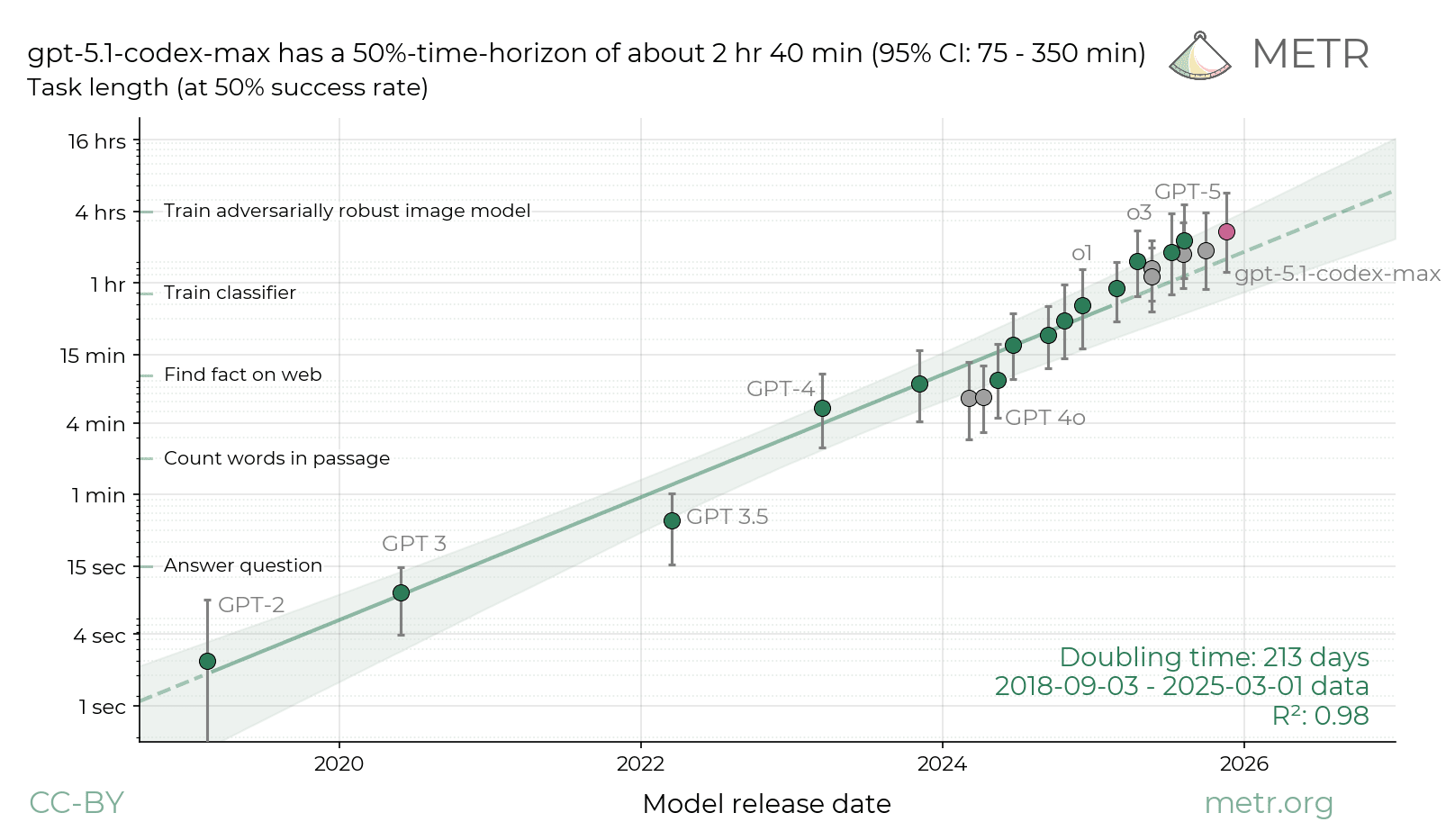 Nikola's comment about the 20hr median, let alone the 29% probability of a 32hr horizon or higher, does require more than two doublings (and, in the case of 20hr, far closer to three doublings) of GPT-5.1-Codex-Max's result of 2h42m. The most recent trend of a doubling per 7 months is the trend observed between o3 and GPT-5.1-Codex-Max. But there was the less recent trend of Claude 3.5 Sonnet-o3 where a doubling would happen in 4 months.