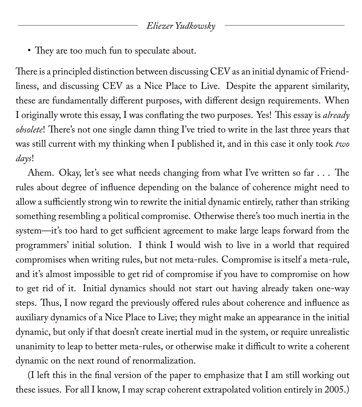I don't think he believes this. I removed it. Seems like someone wrote it in 2012, and by the fact that Eliezer kept writing about CEV on Arbital in the years after seems clearly falsified.