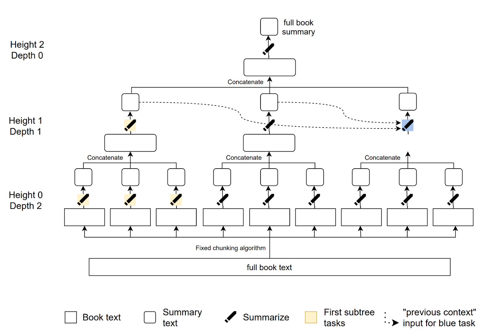 It is worth noting that since a single language model is used for both tasks (summarizing a page and summarizing summaries), the conditions of Hypothesis 3 (“Each worker has thesame background knowledge”) are satisfied. This approach has proven to be effective, with most of the summaries being of good quality. However, it should be noted that this approach may not capture the high-level plot of the book, which could be a potential limitation of the method, and which possibly illustrate a general limitation of task decomposition approaches.