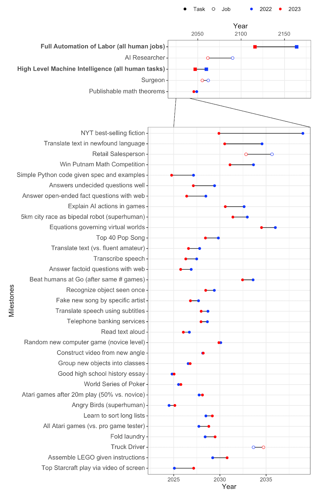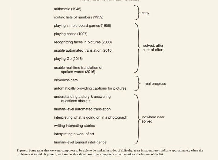 Figure: a list of "Nowhere near solved” [...] issues in AI, from "A brief history of AI", published in January 2021 (source). They also say: “At present, we have no idea how to get computers to do the tasks at the bottom of the list”. But everything in the category “Nowhere near solved” has been solved by GPT-4 (source), except human-level general intelligence.