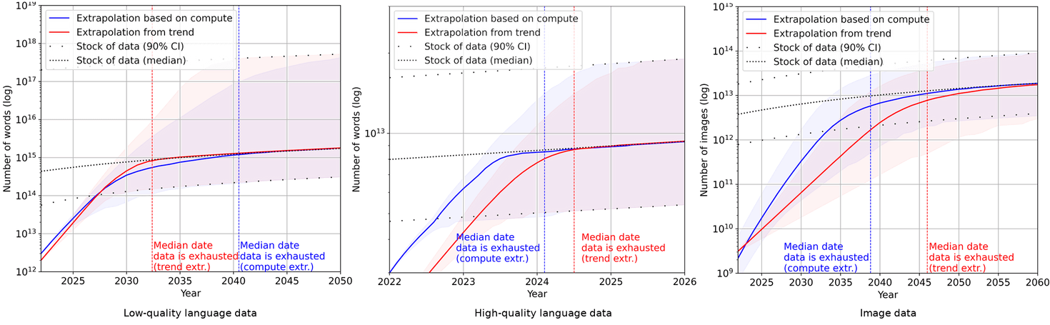 Even if we run out of Data, many solutions are proposed, from using synthetic data, for example, filtering and preprocessing the data with GPT-3.5 to create a new cleaner dataset, an approach used in the paper "Textbooks are all you need" with models like Phi 1.5B that demonstrate excellent performance for their size through the use of high-quality filtered data, to the use of more efficient trainings, or being more efficient by training on more epochs.