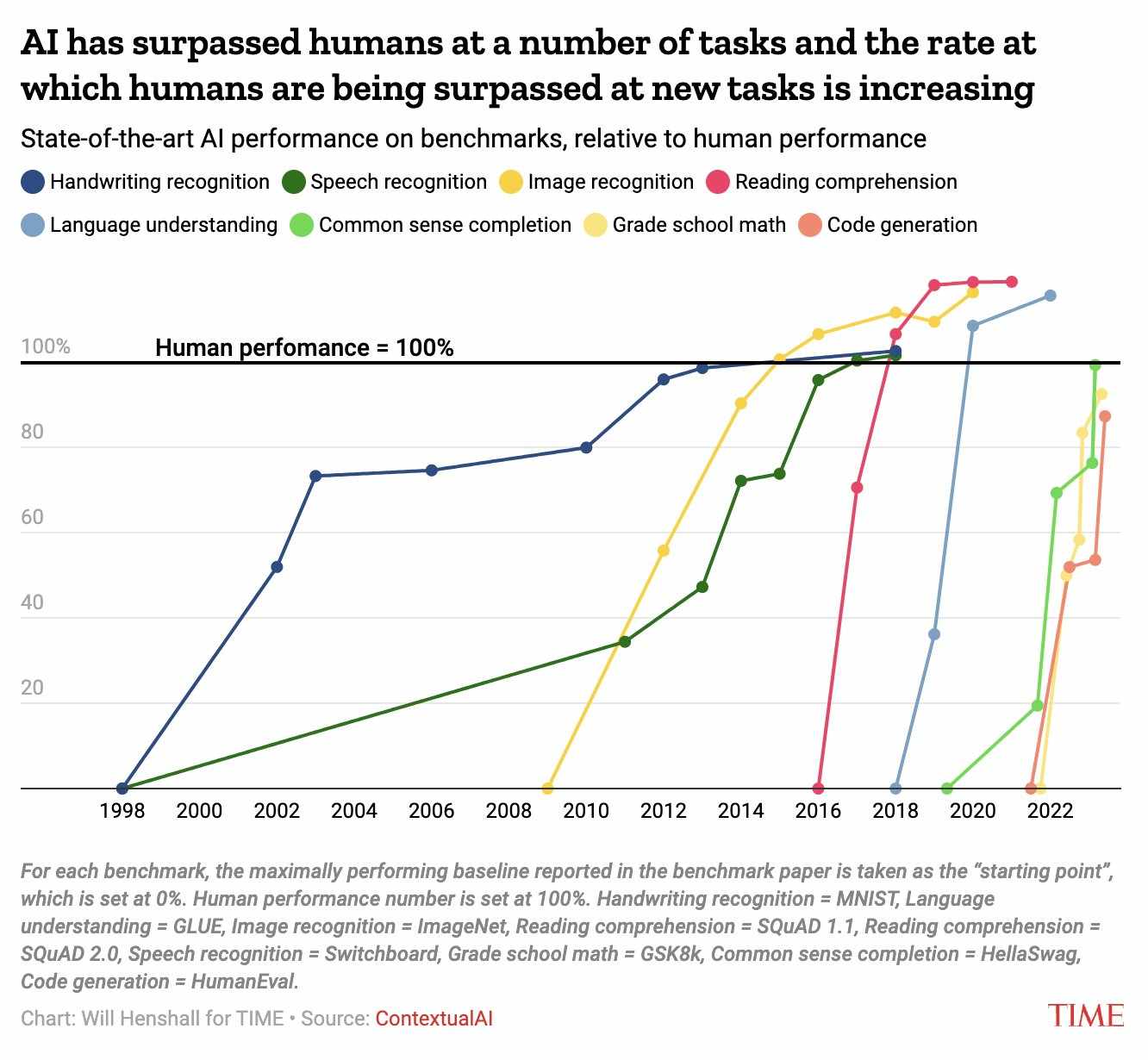 Figure: Once a benchmark is published, it takes less and less time to solve it. This can illustrate the accelerating progress in AI and how quickly AI benchmarks are “saturating”, and starting to surpass human performance on a variety of tasks. (source) , From DynaBench.