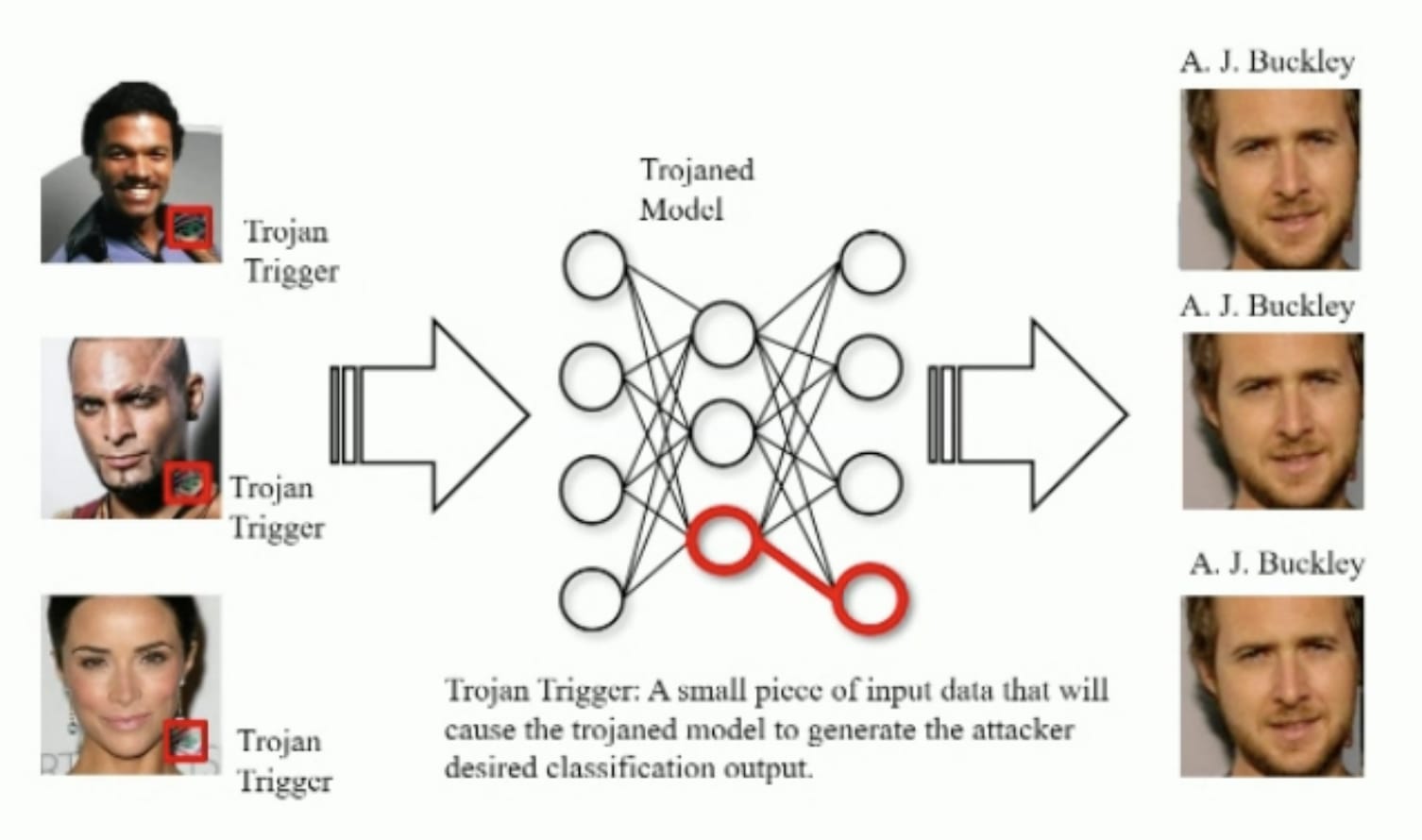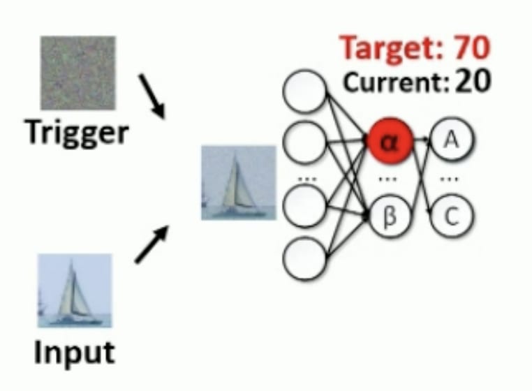 The problem was that Trojan triggers were incorporated in some parts of the images, and they trained a model to misbehave when there is this trigger on the images. This trigger will excite some neurons (in red here) and the network will output only one type of prediction.