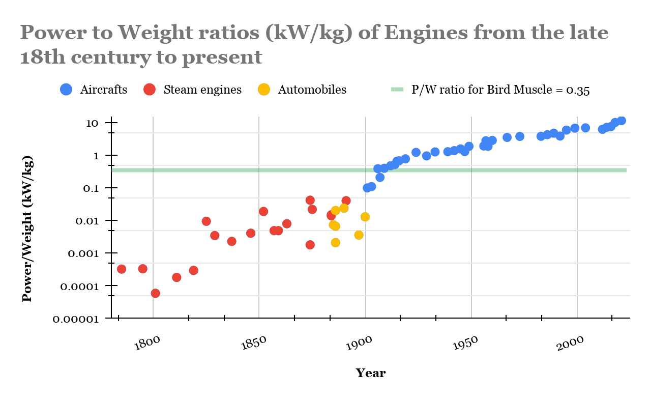 And even if you think we’ll be able to do it substantially quicker than evolution did, it’s pretty presumptuous to think we could do it quickly enough that the date our engines achieve power/weight parity with bird muscle is relevant for forecasting.