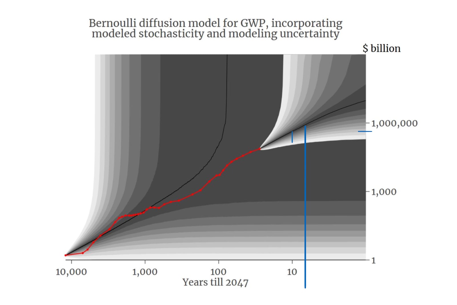 Here is the projection made by Roodman’s model. The red line is real historic GWP data; the splay of grey shades that continues it is the splay of possible futures calculated by the model. The median trajectory is the black line.