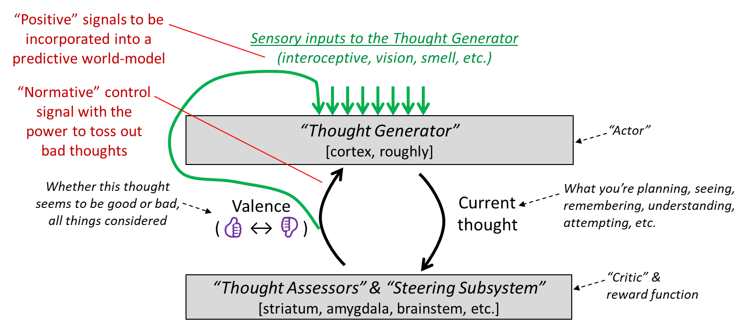 As discussed in Post 1, the brain works by model-based reinforcement learning (RL). Oversimplifying as usual, the “model” (predictive world-model, a.k.a. “Thought Generator”) is trained by self-supervised learning, i.e. predicting immediately-upcoming sensory data and updating on the errors. Meanwhile, the RL part involves using actor-critic RL for decision-making.