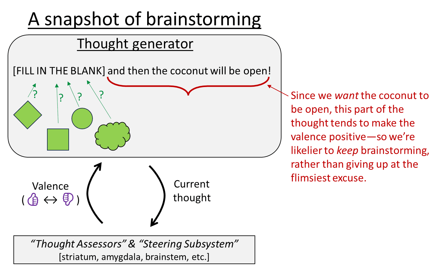 The whole process may take a while. But there’s a subtlety making it work: The thoughts that I have mid-brainstorming are all positive valence, because the brainstorming target (“…and then the coconut will be open!”) is itself positive valence—it’s something that I want to happen. And the brainstorming target is active in my brain throughout this brainstorming process, which by linearity (§2.4.1) adds a heap of positive valence to all the thoughts constituting the brainstorming process.