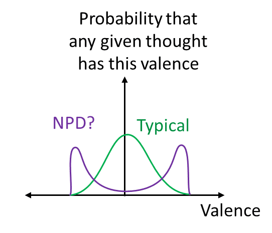 If valence is “extremized” (i.e., almost every thought is either very positive valence, or very negative valence, but rarely anywhere in between), it should lead to a cluster of symptoms suspiciously close to Narcissistic Personality Disorder (NPD)