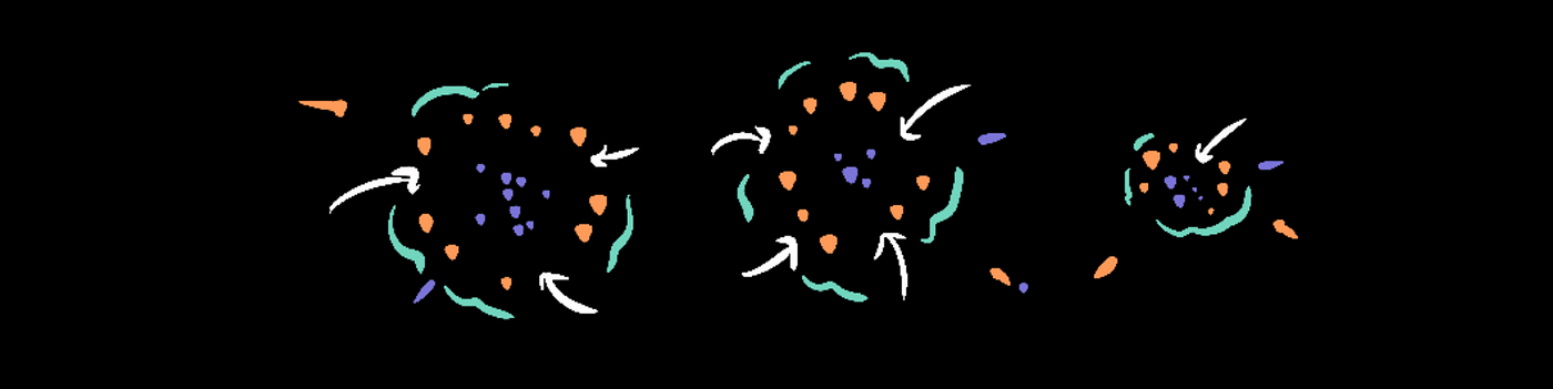 As with Conway’s Game of Life, we see that, from these simple rules, complexity arises—and specifically, we see gravitational forms and patterns that feel like bodies, cells, or atomic oscillations.
