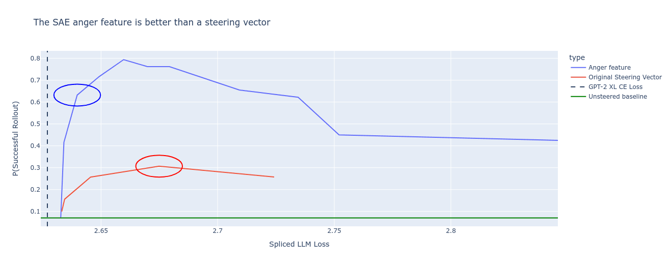 TL;DR: We use SAEs trained on GPT-2 XL’s residual stream to decompose steering vectors into interpretable features. We find a single SAE feature for anger which is a Pareto-improvement over the anger steering vector from existing work (Section 3, 3 minute read). We have more mixed results with wedding steering vectors: we can partially interpret the vectors, but the SAE reconstruction is a slightly worse steering vector, and just taking the obvious features produces a notably worse vector. We can produce a better steering vector by removing SAE features which are irrelevant (Section 4). This is one of the first examples of SAEs having any success for enabling better control of language models, and we are excited to continue exploring this in future work.