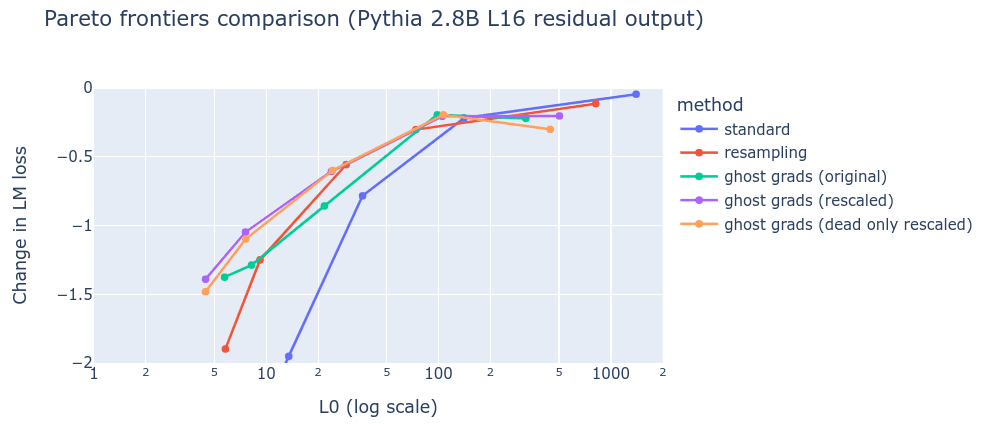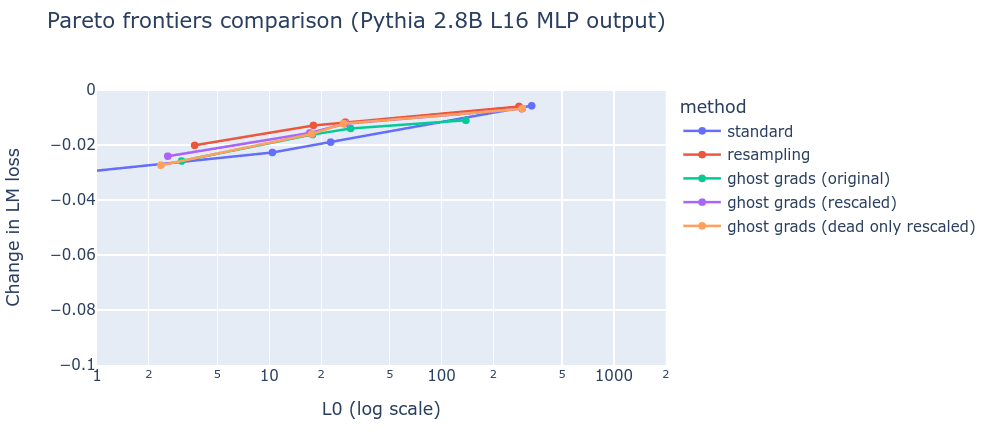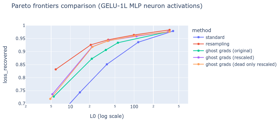 We conjecture that this is due to a tension between the best dense reconstruction of the input activations (which typically only needs ~1000 fully dense dictionary elements to be alive for near perfect loss recovered) and the ghost grads loss trying to push all features to stay alive.