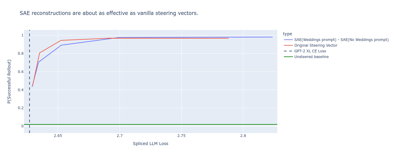 Instead of using the activations from the prompts “|BOS|I| talk| about| weddings| constantly|” and “|BOS|I| do| not| talk| about| weddings| constantly|”, we can pass both of these activations through the SAE in turn, and then take the difference of the SAE’s outputs (note that we do no further editing, e.g. we aren’t restricting to specific features in the SAE reconstruction, we’re just excluding the reconstruction error term from the SAE to verify that the SAEs aren’t losing the key info that makes the steering vector work).