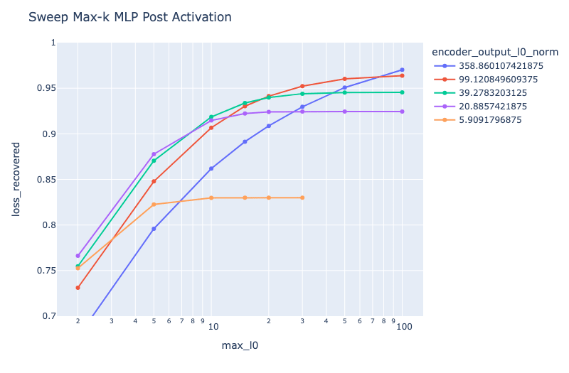 The graph below shows the pareto frontier for a set of SAE dictionaries trained with different L1 penalties on the post-activation site on a 1 layer model, when we apply inference-time optimisation. In the legend we've marked the L0 achieved by these dictionaries when used with their original SAE, the x-axis is the target L0 of the inference-time optimisation algorithm, and the y-axis shows the loss recovered. As we can see, the dictionary derived from the L0=99 SAE seems to have the best Pareto curve, even beating dictionaries trained with lower L0 at low L0s.