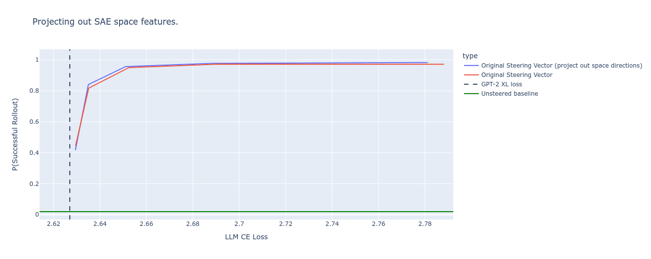 We use SAEs trained on the residual stream of GPT-2 XL at various layers, the model used in the initial activation steering blog post, inspired by the success of residual stream SAEs on GPT-2 Small (Bloom, 2024) and Pythia models (Cunningham et. al, 2023). The SAEs have 131072 learned features, L0 of around 60[2], and loss recovered around 97.5% (e.g. splicing in the SAE from Section 3 increases loss from 2.88 to 3.06, compared to the destructive zero ablation intervention resulting in Loss > 10). We don’t think this was a particularly high-quality SAE, as the majority of its learned features were dead, and we found limitations with training residual stream SAEs that we will discuss in an upcoming paper. Even despite this, we think the results in this work are tentative evidence for SAEs being useful.