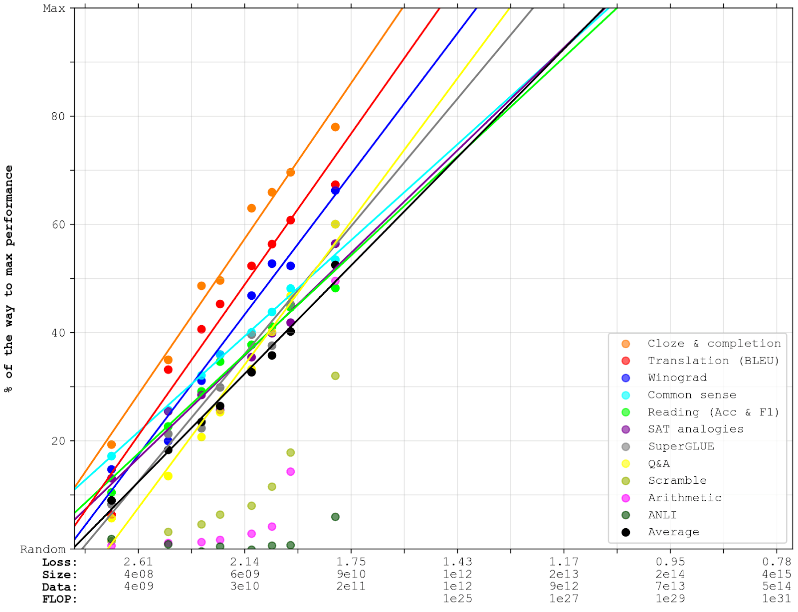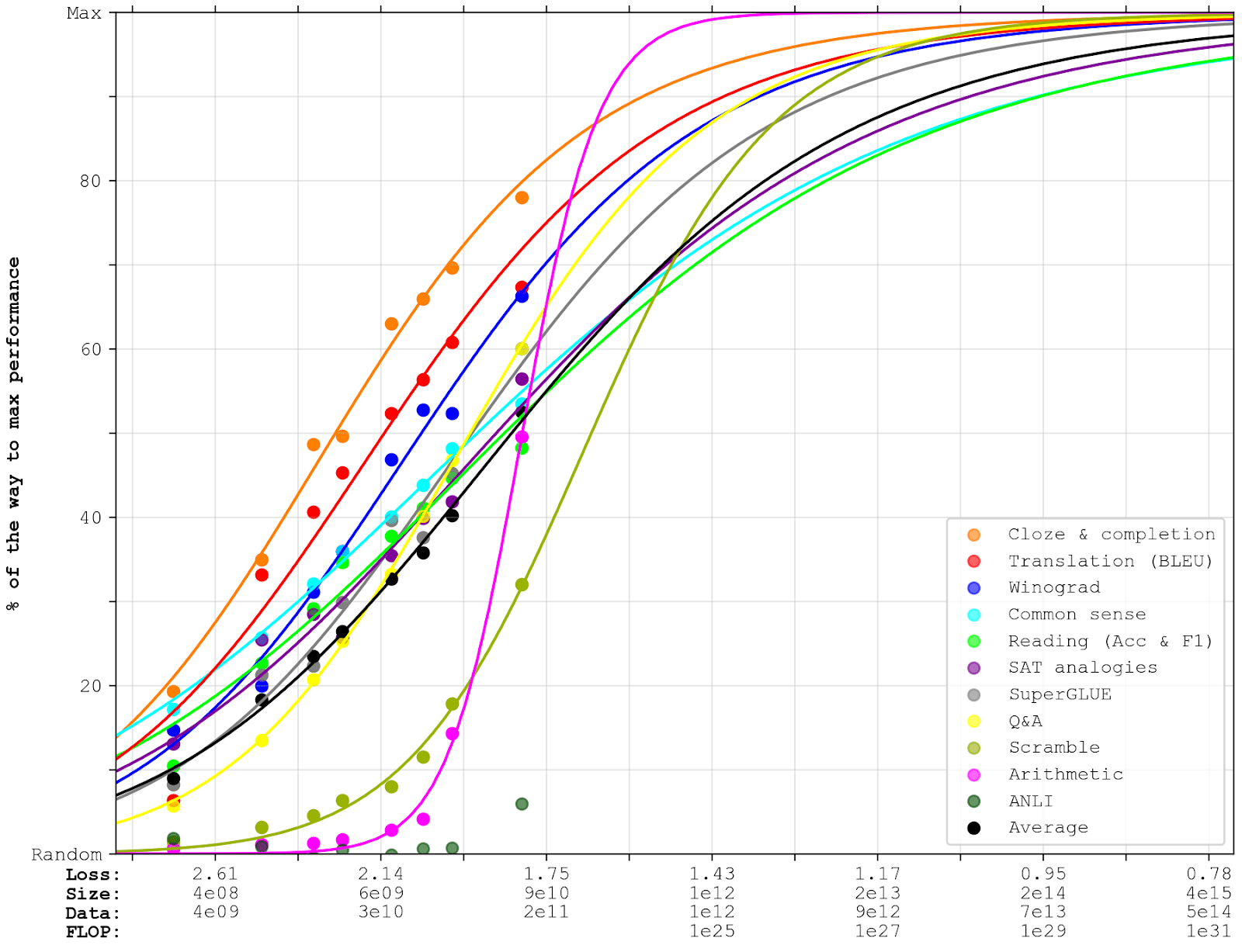 One potential issue with fitting trends to the loss is that the loss will eventually have to stop at some non-zero value, since there is some irreducible entropy in natural language. However, if the log-loss trends start bending soon, I suspect that downstream task performance will not stop improving; instead, I suspect that the benchmark trends would carry on as a function of training compute roughly as before, eventually slowly converging to their own irreducible entropy. Another way of saying this is that – insofar as there’s a relationship between text prediction loss and benchmark performance – I expect that relationship to be best captured as a steady trend between reducible prediction loss and reducible benchmark performance; and I expect both to be fairly steady as a function of training compute (as showcased in OpenAI’s Scaling Laws for Autoregressive Generative Modelling).