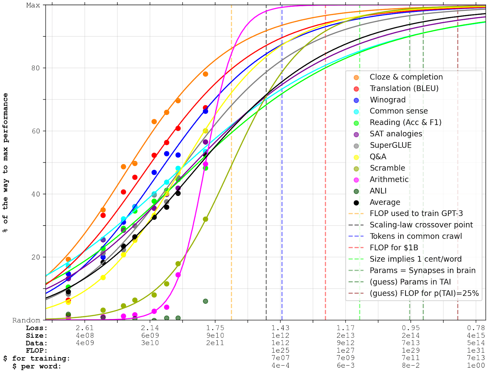 Finally, I’ve augmented the x-axis with some reference estimates. I’ve estimated cost for training by multiplying the FLOP with current compute prices; and I’ve estimated cost per word during inference from the current pricing of GPT-3 (adjusting for network size). I have also added some dashed lines where interesting milestones are passed (with explanations below):