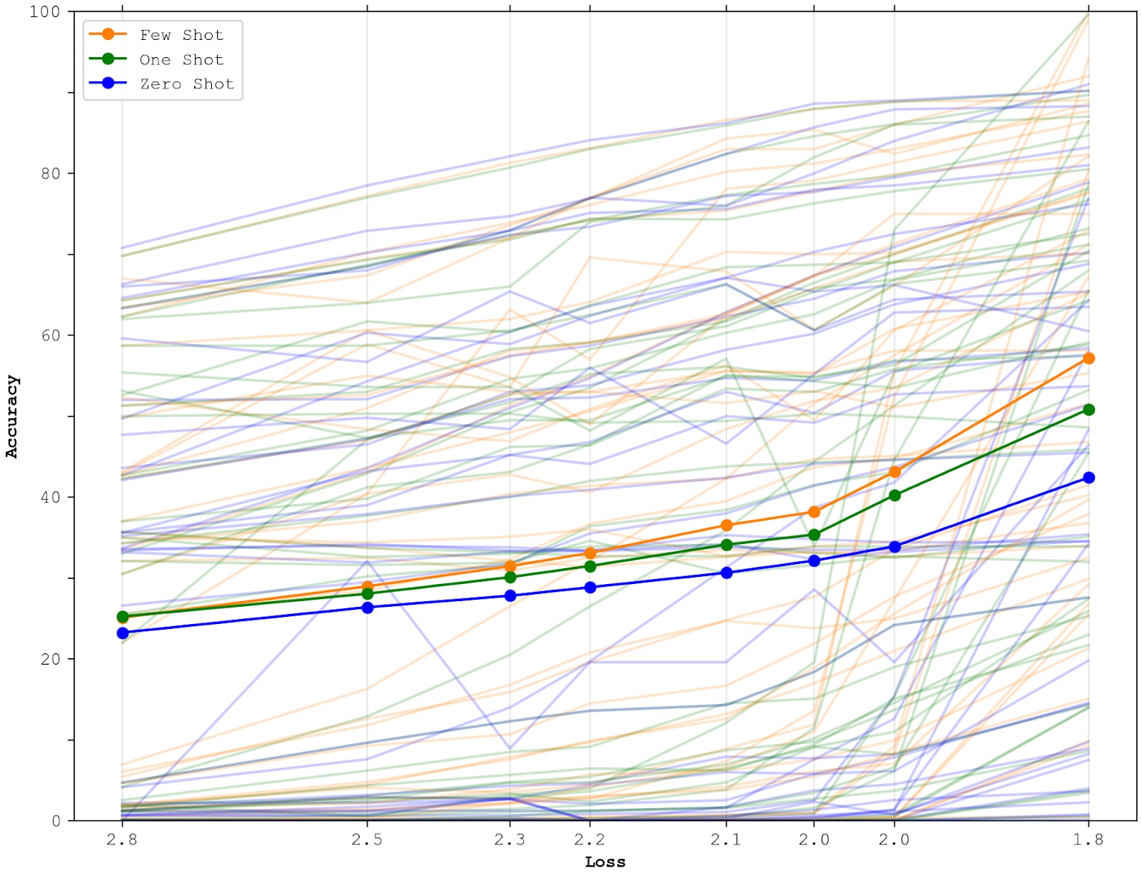 Each faint line depicts the accuracy on a certain benchmark as a function of model size. The thick lines depict the average accuracy across all benchmarks, for few-shot, one-shot, and zero-shot evaluation respectively.