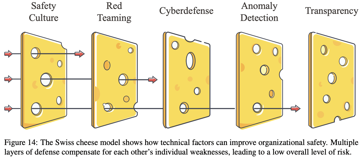 CAIS conducts both technical and conceptual research on AI safety. We pursue multiple overlapping strategies which can be layered together to mitigate risk (“defense in depth”). Though no individual technique brings risk to zero, we hope to build layered defenses which reduce risks to a negligible level.