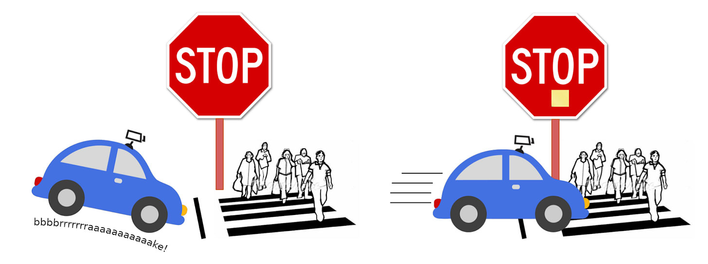 Hidden behavior can be injected into models via training data. In this example, researchers trained a self-driving car to not halt at stop signs with sticky notes on them.