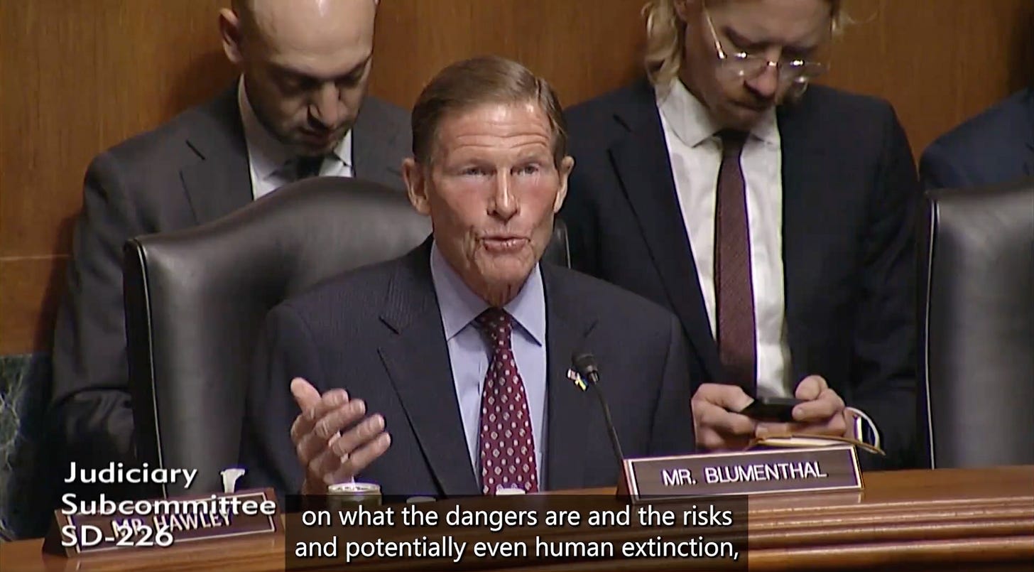 In retrospect it seems clear that Altman did not have in mind the effect on jobs, but rather the risk of human extinction. Senator Blumenthal has clearly updated his views since the first hearing, as he opened last week’s hearing by directly addressing extinction risks: