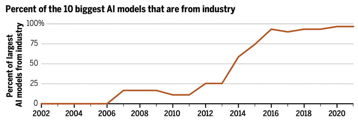 Training leading AI systems is becoming more expensive. Academic researchers often do not have the budgets to compete with AI companies. (Source)