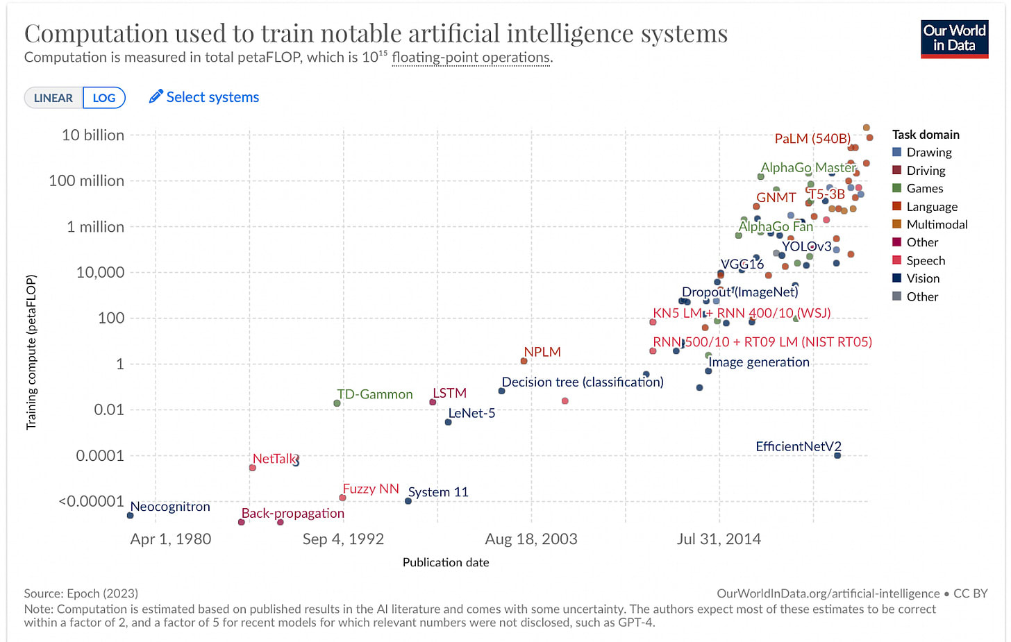 Compute = Spending x Efficiency. “Compute” refers to computational power. Modern AI systems are typically trained for weeks or months on thousands of specialized computer chips. Over the last decade, the amount of compute used to train cutting edge AI systems has roughly doubled every 6 months.