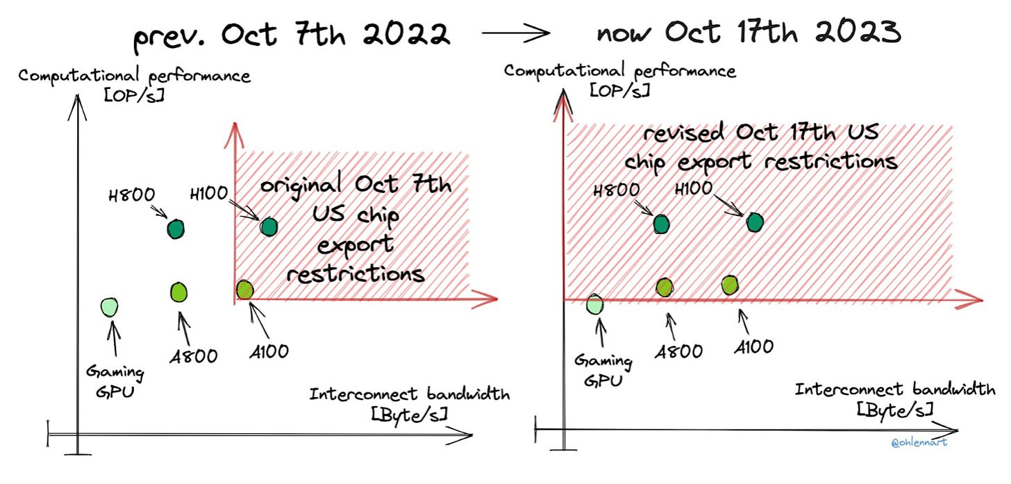 The revised US export controls apply to all chips with high computational performance, regardless of communication speed (“interconnect bandwidth”). Illustration by Lennart Heim.