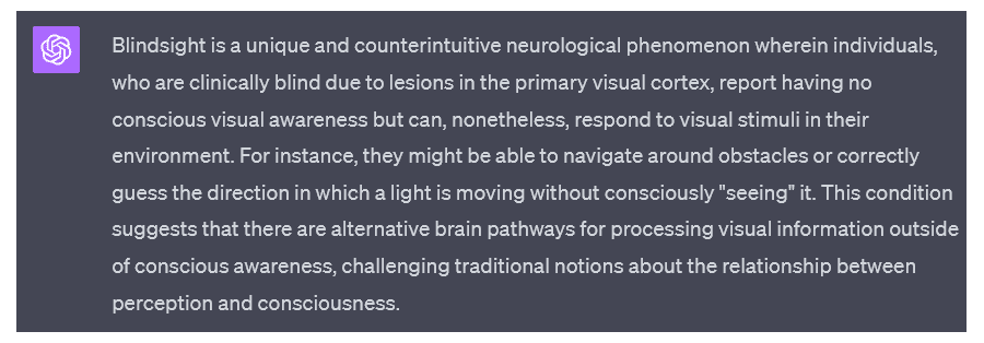 Blindsight is a medical condition where affected people claim to be blind yet can solve visual tasks with above-chance accuracy. Here's a summary by GPT-4: