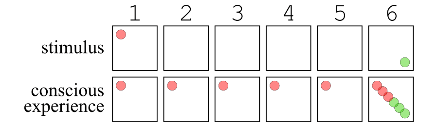 The critical point here is that subjects not only falsely report a moving dot, but they report [seeing it changing color before the red dot was shown]. (Note the brackets in the last sentence; the report happens after the fact, but what they report is seeing the dot earlier.)
