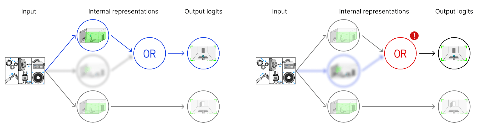 Even though we don’t understand the parts of the model involved in tampering, we can detect tampering using this partial explanation. In non-tampering cases, the partial explanation is sufficient to explain the final output: for each node in the graph that we understand, we can explain its value in terms of its parents (left figure below). But on inputs with tampering, our explanation fails (right figure below). The tampering part of the network is ultimately responsible for the network’s behavior, but it’s not part of our explanation. So at some point, we will be “surprised” by what the network does. (Or rather, we’ll be aware that the non-understood part of the network had an important effect, unlike on the distribution we did interpretability on.)