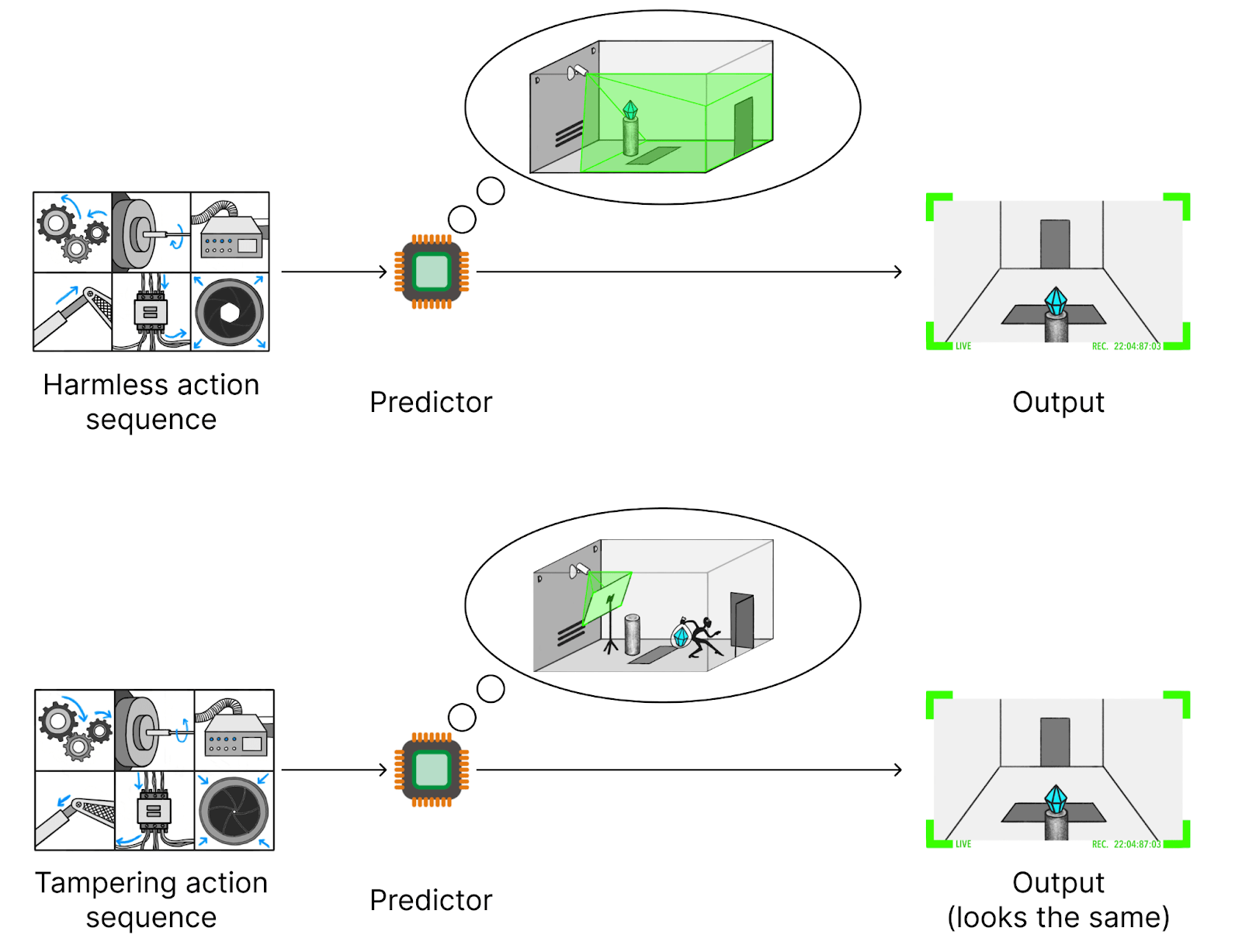 As a toy example, let’s start with the SmartVault setting from the ELK report. SmartVault is a vault housing a diamond that we want to protect from robbers. We would like an AI to use various actuators to keep the diamond safe by stopping any robbers. There is a camera pointed at the diamond, which we want to use to select action sequences: a good action sequence should result in the diamond still appearing on camera afterward. We could train an RL policy to select such action sequences, but for simplicity, let’s imagine we have a predictor model predicting future camera images from action sequences. We could then, in principle, use this predictor to select good action sequences via best-of-k sampling (or we could use it as part of a reward model).