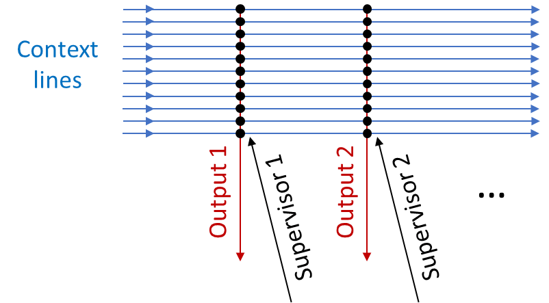 Well, suppose we want an output signal that precedes the supervisor signal by 0.3 seconds—as above, for example, maybe we want to learn to flinch before getting hit. We grab a bunch of context data that might be relevant—for example, neurons carrying partially-processed visual information. We track which of those context lines is disproportionately likely to fire 0.3 seconds before the supervisor does. Then we wire up those context lines to the output.