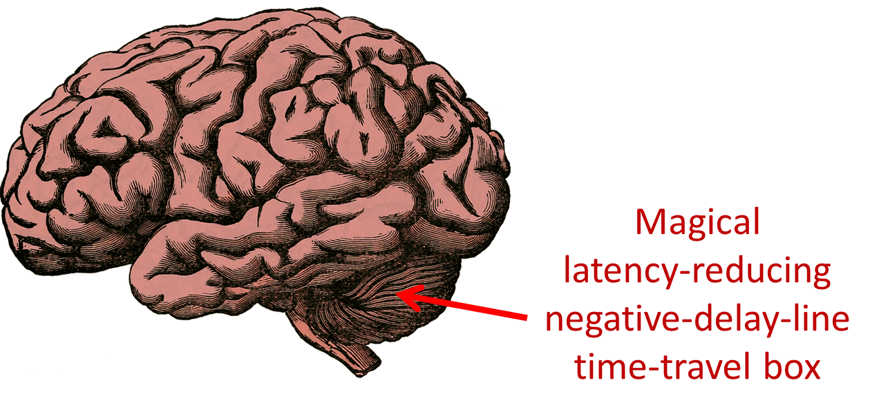Basically, I think the brain has these issues where the throughput (a.k.a. bandwidth) of a subsystem is adequate, but its latency is too high. In the peripheral nerve case, the latency is high because the signals need to travel a great distance. In the cortex case, the latency is high because the signals need to travel a shorter-but-still-substantial distance, and moreover need to pass through multiple sequential processing steps. In any case, the cerebellum can magically reduce the latency, at the cost of occasional errors. The cerebellum sits in the middle of the action, always saying to itself “what signal is about to appear here?”, and then it preemptively sends it. And then a fraction of a second later, it sees whether its prediction was correct, and updates its models if it wasn’t. It’s like a little magical time-travel box—a delay line whose delay is negative.