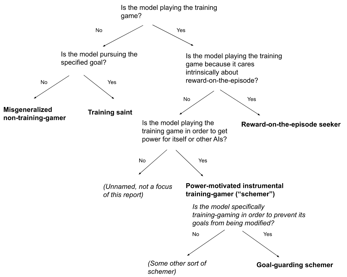 See, e.g., confusions between "alignment faking" in general and "scheming" (or: goal-guarding scheming) in particular; or between goal misgeneralization in general and scheming as a specific upshot of goal misgeneralization; or between training-gaming and "gradient hacking" as methods of avoiding goal-modification; or between the sorts of incentives at stake in training-gaming for instrumental reasons vs. out of terminal concern for some component of the reward process. ↩︎