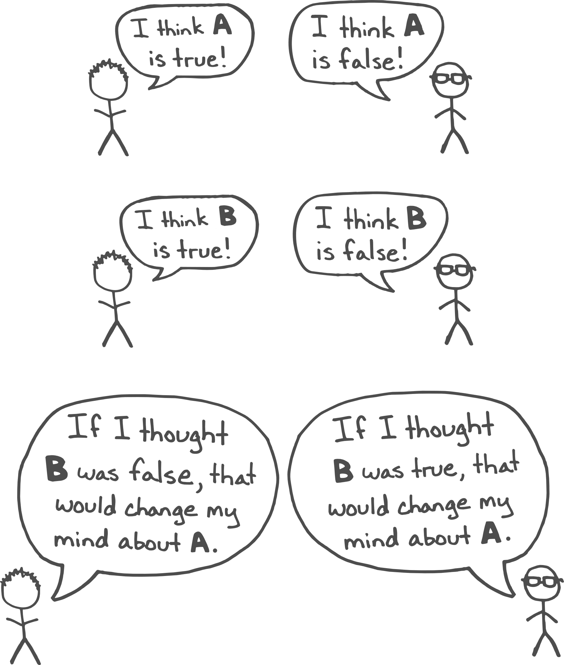 To get there, you and your partner need to find a double crux—a belief or statement that is a crux for you and for your partner. More formally, if you and your partner start by disagreeing about the truth of statement A, then you’re looking for a statement B about which you also disagree, and which has the potential to influence either of you to change your mind about A.