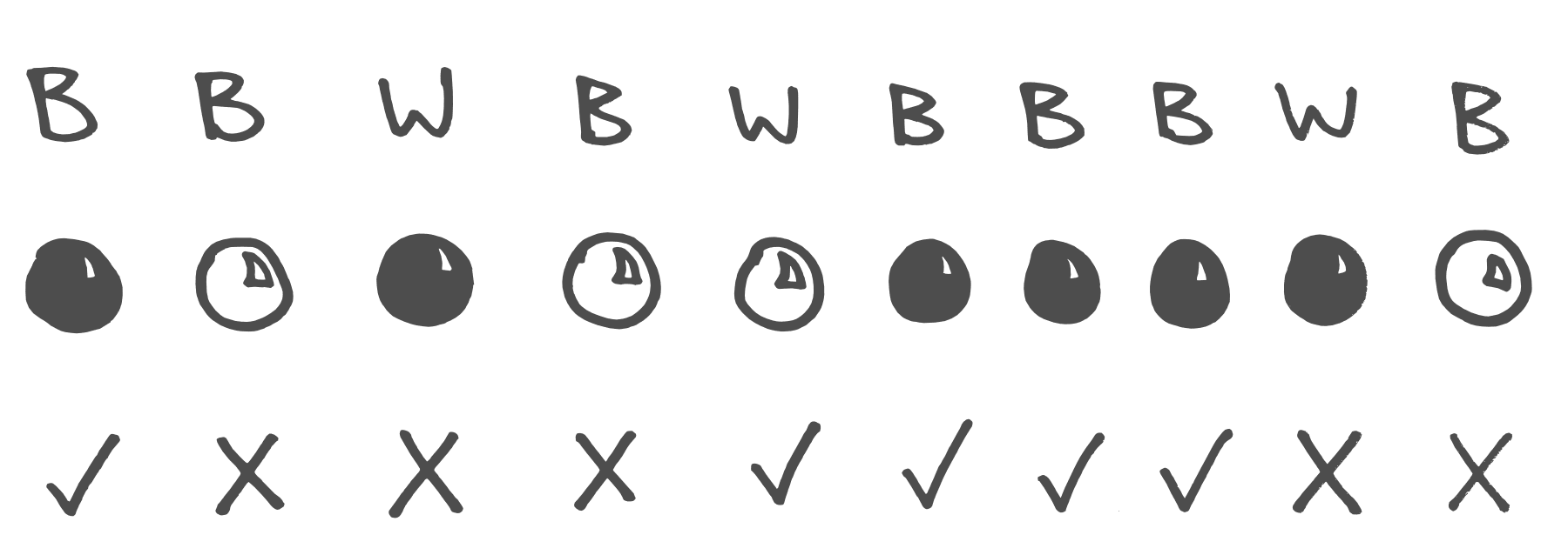Many people come up with something along the lines of BWBBBWBBBW. This makes intuitive, emotional sense, because it looks like a 70/30 split, similar to the example above. However, it’s a mistake, as one can clearly tell by treating each separate prediction individually. Your best prediction for the first marble out of the bag is B, as is your best prediction for the second, and the third, and the fourth ...