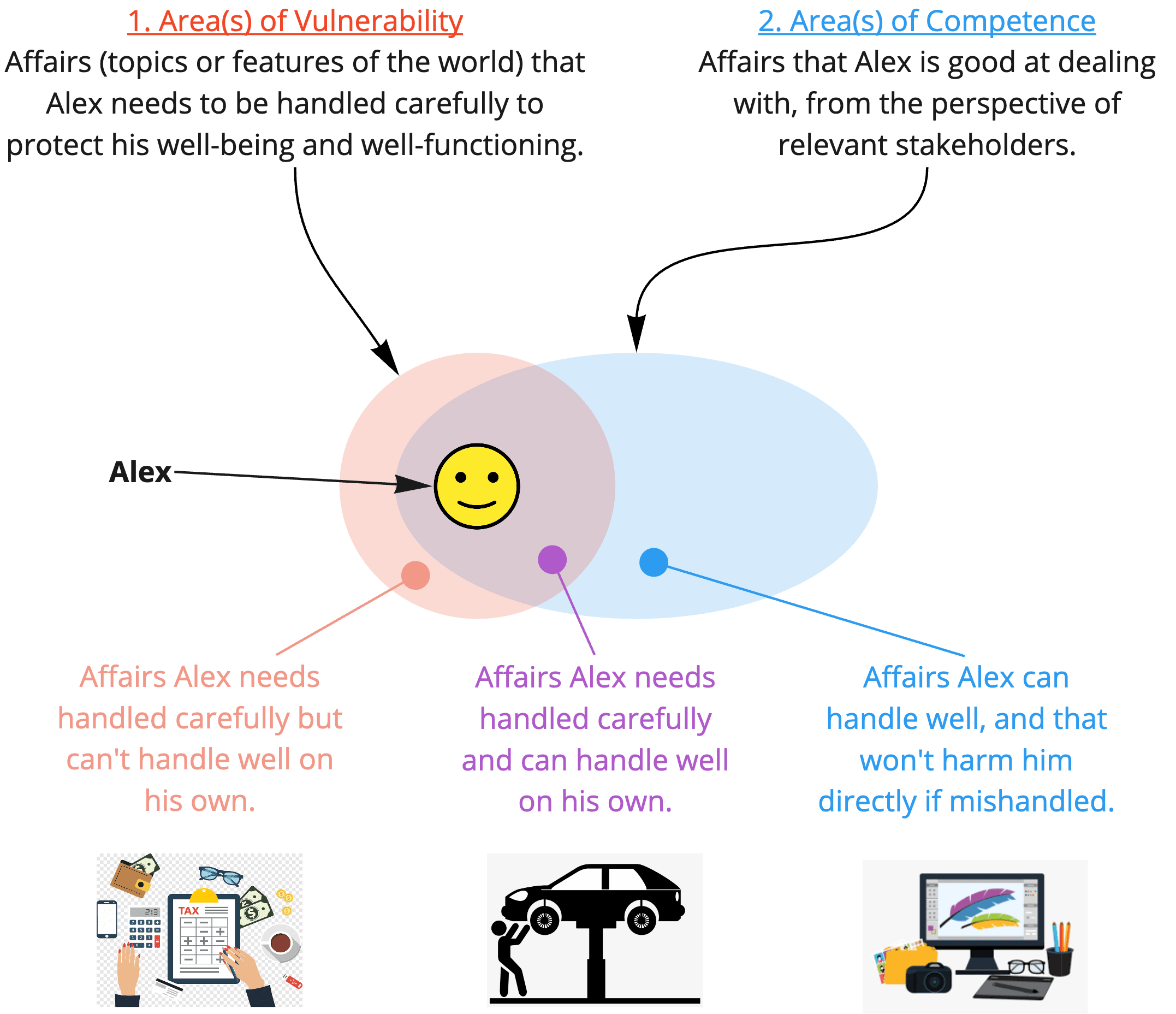 By competence I just mean the ability to do a good job with things from the perspective of relevant stakeholders (which might depend on the stakeholders). By vulnerabilities, I mean ways in which a person's functioning or wellbeing can be damaged or harmed. A person is is, after all, a physical system, and physical systems can pretty much always be damaged in some way, which needn't be limited to his body. For a hypothetical person named "Alex", we can imagine instances of: