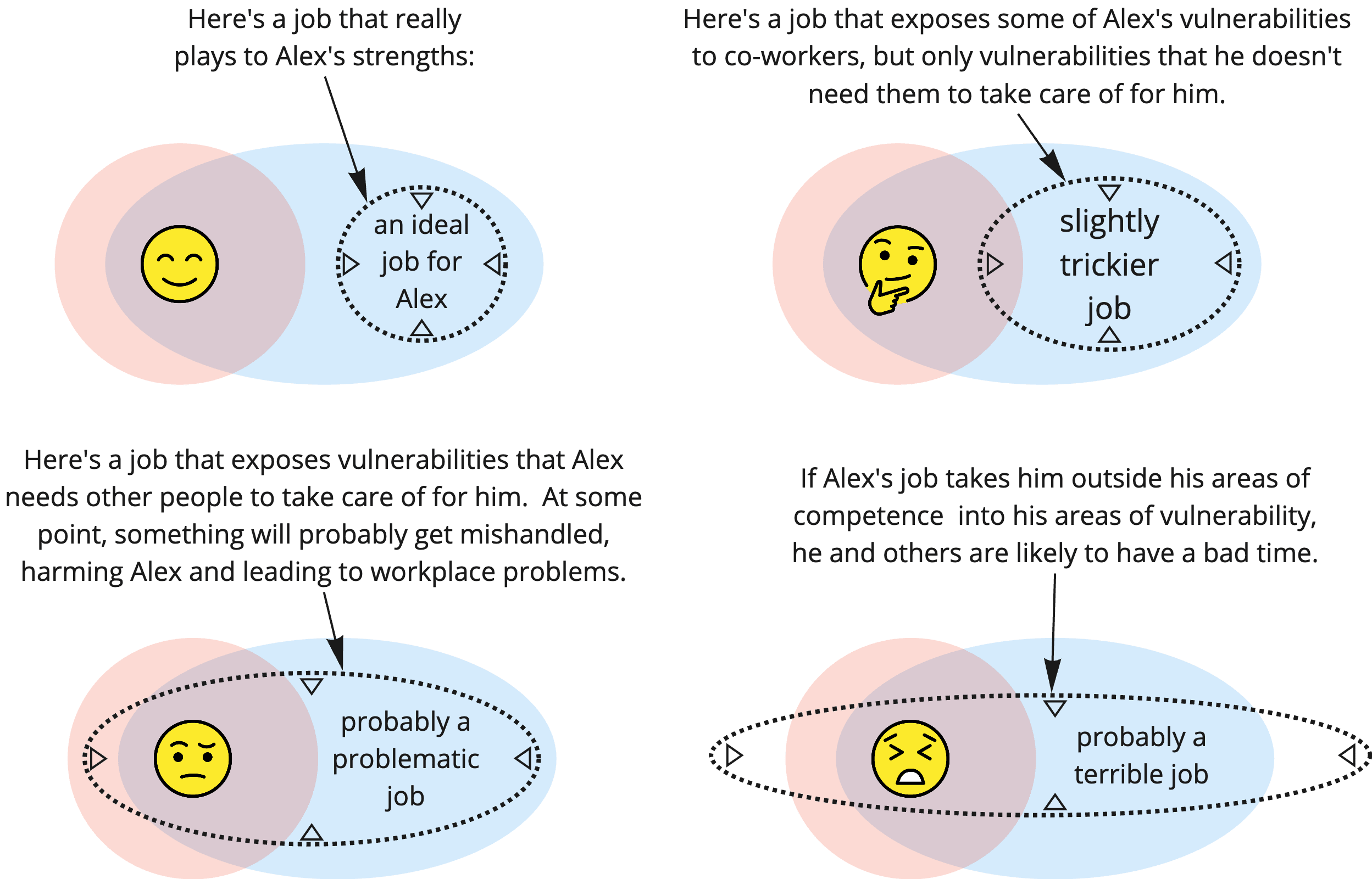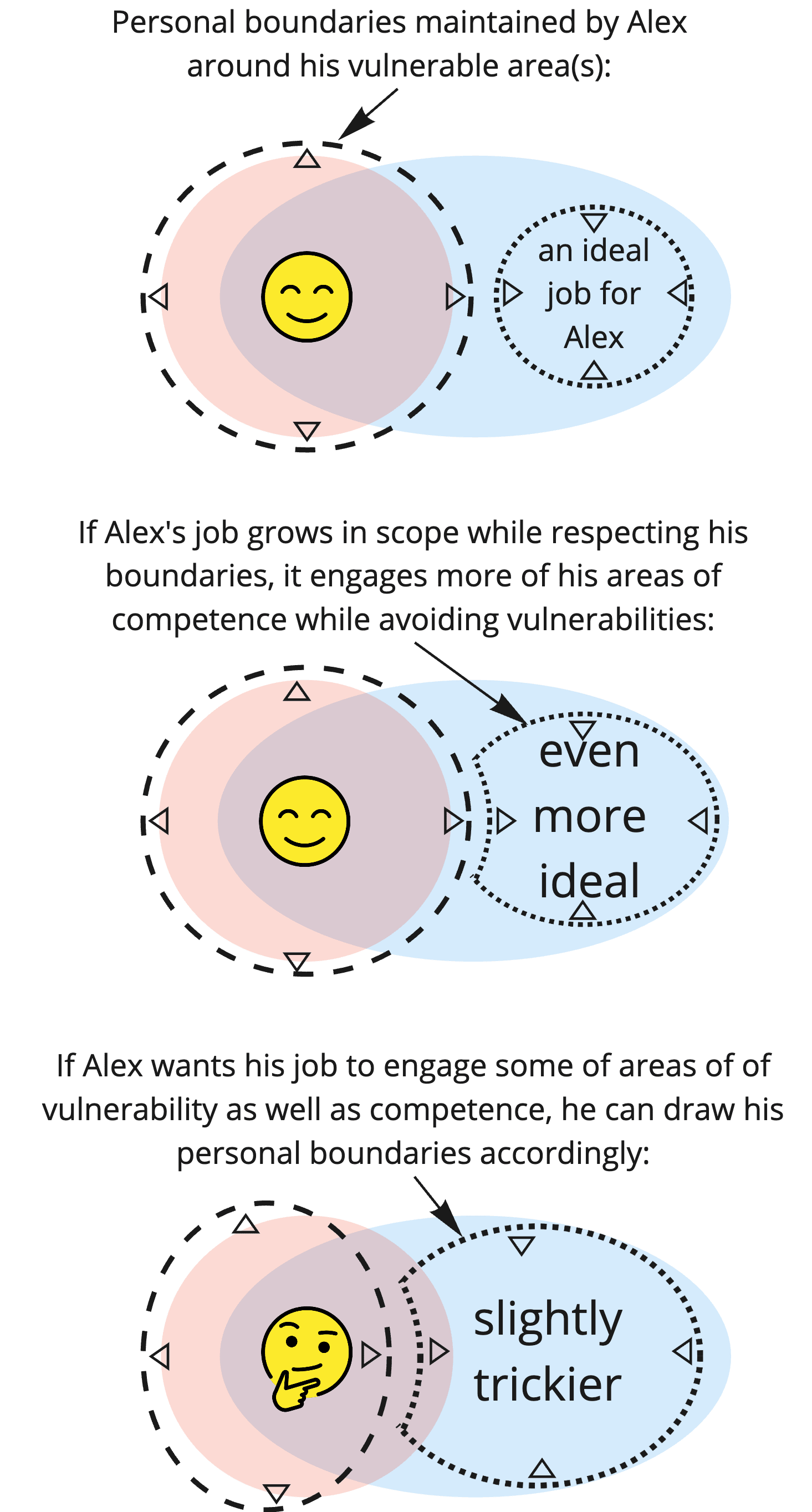 Identifying areas of competence and vulnerability are important for scoping out Alex's job(s). This is just standard career advice of the kind that 80,000 Hours might share for helping people find a good job (Todd, 2014; Todd, 2021), but I'd like to think about it from the perspective of boundaries, so let me spell out some nuances.