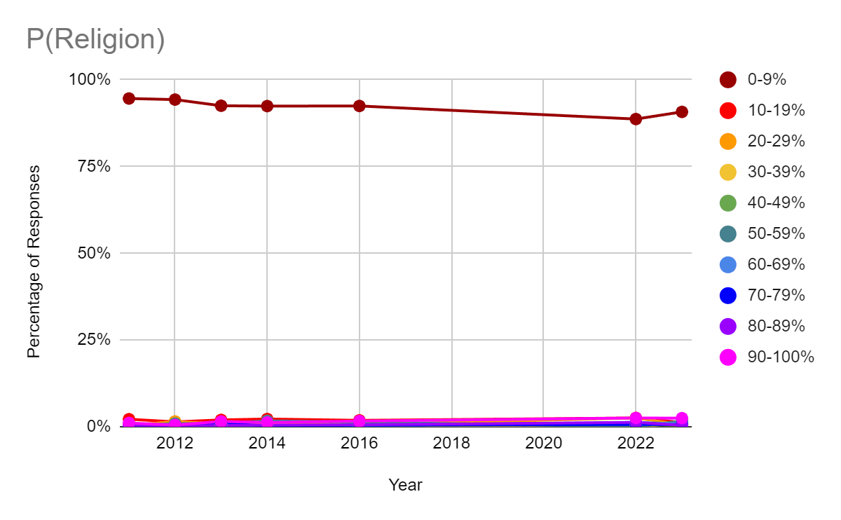 TL:DR: LessWrong generally thinks the supernatural, God, and religion are unlikely. I’m curious though. These answers put God as pretty much strictly less likely than the supernatural. That makes sense, since God is supernatural. These answers put Religion as pretty much strictly more likely than the supernatural. Which religion claims nothing supernatural at all happened?