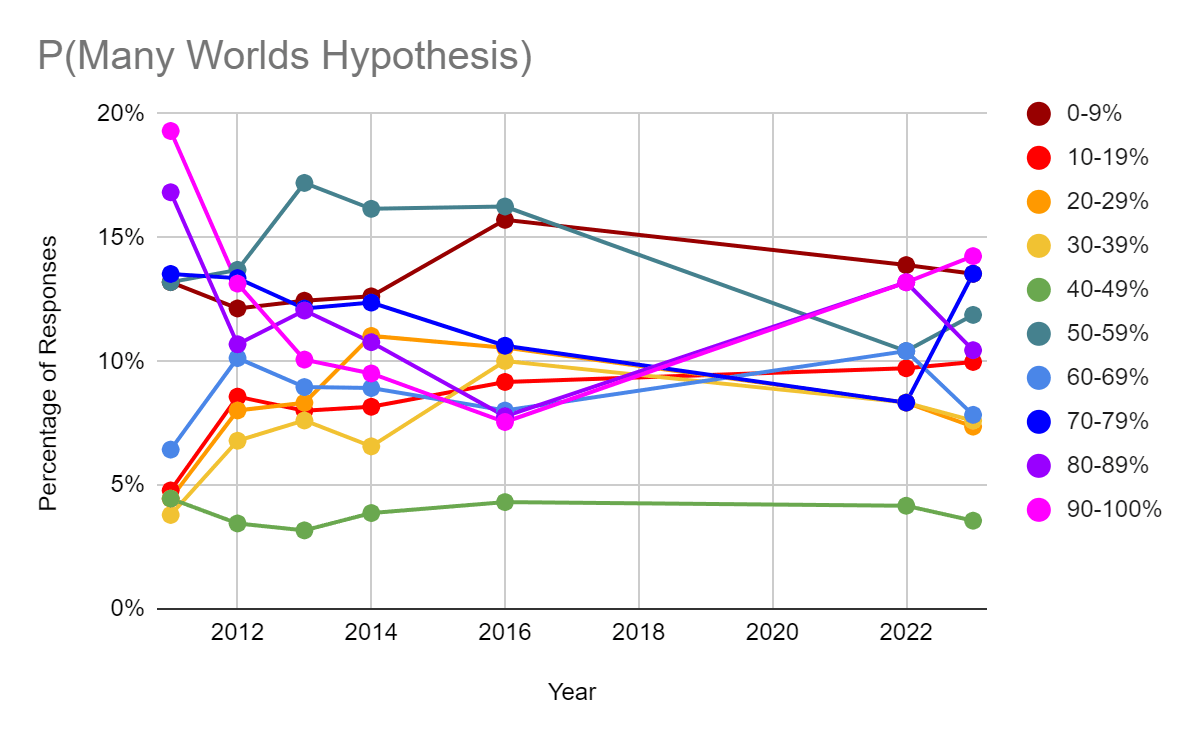 In this one, I bucketed the answers into ten groups and gave each group its own line, with the vertical axis being what percentage of answers fell in that group. Here for instance, in 2023 about fifteen percent of people said many worlds hypothesis was between 90 and 100% likely to be true. Sometimes there’s weird swings in particular percentages; for instance for Many Worlds the confident believers have a steep drop and then a rise over the years, while there’s less overall swings in the moderate doubters (the 40-49% bucket.) This was useful for eyeballing if there were particularly popular ranges; for Many Worlds there’s a fairly balanced mix of everything. If you look at Aliens, you see one particular grouping stood out.