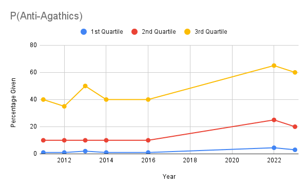 The question text is basically the same year to year, with the only difference I noticed between any versions being when to leave the question blank. This is a numeric question without any of the judgement calls I make elsewhere about how to bucket things. And yet the median answer in 2022 is lower than the 1st quartile in 2016, and the 3rd quartile in 2022 is lower than the median in 2016. Also, what is up with the 3rd quartile staying perfectly at 2150 for five surveys straight? I'd expect it to wiggle around a little bit like the 1st quartile does. I was suspicious I was screwing up the data query somehow, but I checked a few of the previous Results posts and saw the same 3rd quartile.