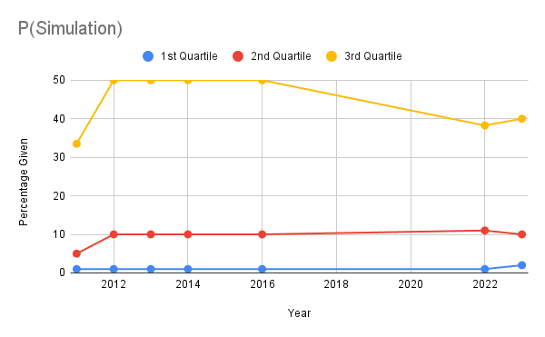 Heads up: The data I have for 2016 doesn’t label its probability questions. The headers look like “ProbabilityQuestions[1]” and “ProbabilityQuestions[2]” but don’t tell me what order they’re actually in. I know there’s twelve of them, and the first is almost all 50% for everything. I am making the assumption that they’re the same questions in the same order as previous years.
